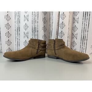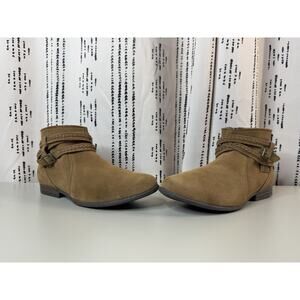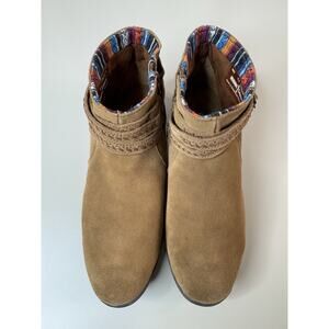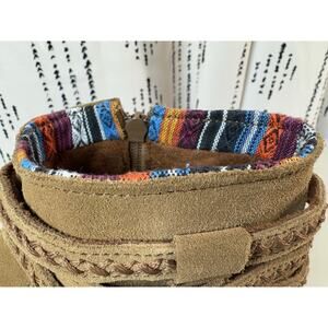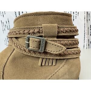Great preowned condition! Short style Minnetonka Dixon boot in dusty brown suede with colorful inner detailing and decorative suede buckles. Great comfortable style boots with a padded insole so you can stay comfortable all day long. Soft and supple dusty brown suede. Woven Arizona fabric inner trim. Fully padded insole. 3/4 " faux stacked heel on a rubber Rancho sole. Side zipper. Height 4 1/2 inches