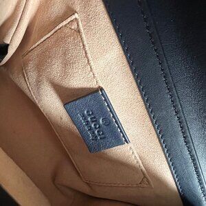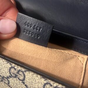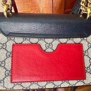 This is an authentic GUCCI GG Supreme Monogram Small Padlock Shoulder Bag in Navy. Gucci GG monogram in navy and beige with red leather accents. The bag features a navy leather flap and a polished gold chain shoulder strap with off white leather sides. The flap opens to a beige suede interior with a patch pocket in excellent condition. There is a red clochette with two keys enclosed, and a red leather card pouch on the reverse.