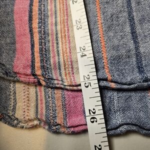 Isaac Mizrahi Live striped shirt with 4-button front placket. Long sleeves with button cuffs. Substantial weight fabric, size 2X. Blue denim shade, orange, yellow, cream, etc.