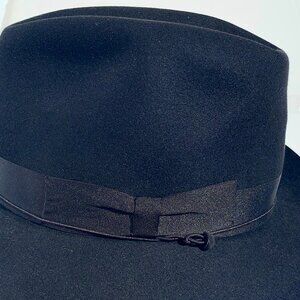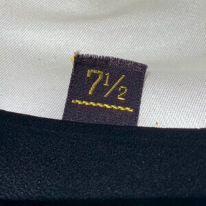 This hat is from the 80’s – I remember when I bought it! Comes in luxurious, soft black fur felt – the gold standard of materials. Features gold colored accents, a grosgrain ribbon hat band; there’s even a subtle elastic “strap” to help keep it in place on a windy day.