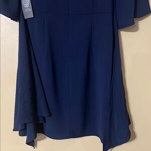 Elevate your evening style with this elegant blue sheath dress by Vince Camuto, designed for a cocktail night out. The dress features a classic crew neck and charming short flutter sleeves, offering a sophisticated silhouette. Its midi length ensures a timeless appeal, perfect for any special occasion.