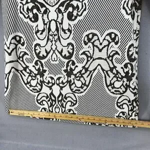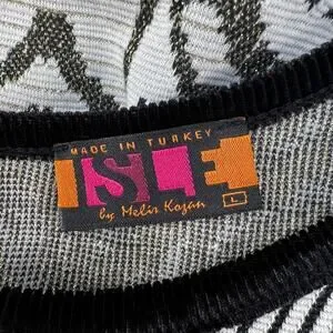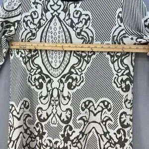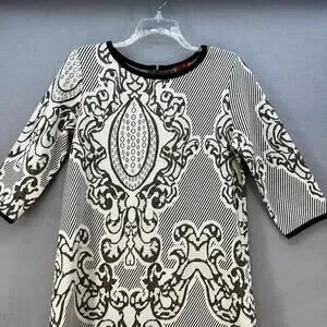 Isle by Melis Kozan Women's Dress. Tagged size L. Black and white in color. This Isle dress is a timeless classic in a sheath style with an intricate design highlighted with a gold shimmer thread it is sure to stand out in a crowd. This dress features a knit fabric, 3/4" sleeve, round collar, zipper closure and is approximately knee length (see measurements below) depending on your height. In preowned condition with minimal signs of wear.