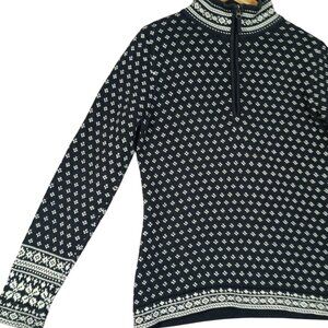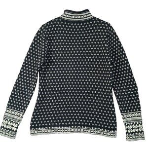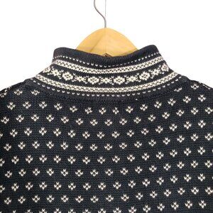 L.L. Bean, 100% Cotton, Nordic Fair Isle Sweater, 1/4 Zip, Black/White, Med.-Reg, Long sleeve, Mock Neck. This gorgeous beauty is more like a jacket, it has a relaxed fit and is such a classic. It is the kind of sweater you wear if you go somewhere cold and you want to look like you live there and aren't just visiting. It is in very good condition, though ********PLEASE NOTE:I noticed some sign of wear at the top of the collar around the zipper. The last three photos are of the area I am referring to with different points of view.********** This is a sweater you can keep for years to come.