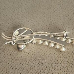 This vintage brooch is a stunning piece of jewelry that will add a touch of elegance to any outfit. The brooch features a beautiful round rhinestone in a pastel silvertone color. The stone is surrounded by smaller crystals, creating a intricate design that is sure to catch the eye. Measuring at 2 inches in length, this brooch is perfect for wearing on a lapel or blouse. The brooch is made of high-quality materials, ensuring that it will last for years to come. Whether you're a collector or simply looking for a unique accessory, this vintage brooch is a must-have.