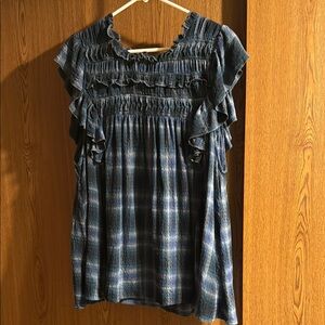 Stylish blue plaid top with ruffle sleeves, perfect for any occasion.