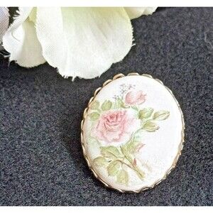 ELEGANT VINTAGE BROOCH FEATURING A DELICATE CERAMIC FLOWER CAMEO SET IN A GOLDTONE FRAME. MEASURING 1.5 INCHES, THIS TIMELESS PIECE ADDS A TOUCH OF VINTAGE CHARM TO ANY OUTFIT OR COLLECTION.
