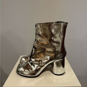 The Tabi boots in the broken mirror finish feature the Maison's iconic Tabi split-toe shape. They have a cylindrical high heel. Tabi styles are inspired by the traditional 15th century Japanese sock bearing the same name. It captures the avant-garde and insubordinate spirit of the Maison and exists as a heritage classic, continually explored through each collection.