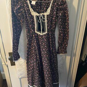 1980 (I know because I wore it to graduation!) Gunne Sax dress, floral and dot print. Long sleeves, mid calf length. Cotton. Nothing ripped or torn, good condition. Self fabric ties in the back. Lace trim.