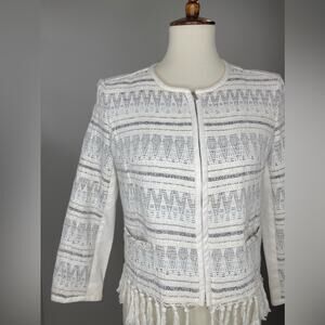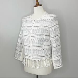 An Aztec pattern and corded fringe offer a chic, tribal-inspired vibe in a richly textured jacket modernized with a touch of metallic shimmer.