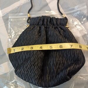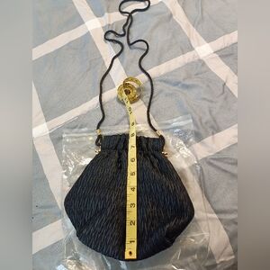 This is a beautiful black evening purse with a textured, silky feel. Long, thin shoulder rope and gold accents. Great for prom, Mother of the Bride, or any formal occasion. Excellent unused condition.