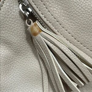 This chic cream clutch from Express features a stylish flap closure with a decorative tassel, making it a perfect accessory for any occasion. Its compact design ensures it holds your essentials while adding a touch of elegance to your ensemble.