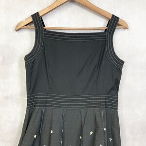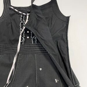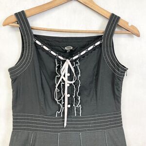 -Features: ruffled hem, sleeveless, decorative buttons on bodice