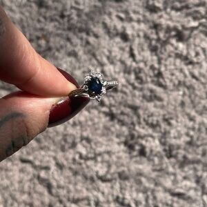 This Vintage Ring is 14k white gold with 28 (Natural) diamonds at .33 total weight Hl color SI clarity 7x5 mm Sapphire (Natural NOT lab created) Blue Sapphire.The Ring is a women's size 8 BUT can fit 7.5 finger.Photos doesn’t do this ring justice.The blue color in the Sapphire is absolutely stunning when the light hits it and the diamonds sparkle a lot! I purchased the last one in the company so you can’t get it anywhere else. Please contact me if you have any questions.