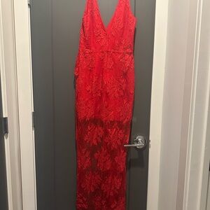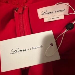 HOT!!!!! Elegant red dress by Lovers + Friends. Features a stylish, flattering v neck design with a zip closure. All lace, lined and side slit.