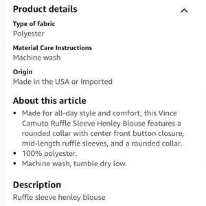 Made for all-day style and comfort, this Vince Camuto Ruffle Sleeve Henley Blouse features a rounded collar with center front button closure, mid-length ruffle sleeves, and a rounded collar.