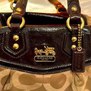 Gently used, in excellent condition bag features one big compartment with built in pockets inside. In tan logo embossed fabric and rich brown leather with golden hardware.