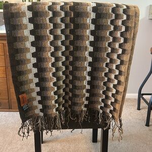 Chic Missoni scarf with a zigzag design. Features brown and cream tones. A stylish accessory for any wardrobe. 18 x 72 Wool blend