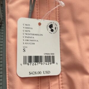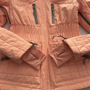 Made for the slopes this ski ready jacket features are fully waterproof design that keeps moisture out with a Primaloft insulated design to keep you warm while staying lightweight and locking out the cold with a fitted silhouette and adjustable hood and neck line. You’ll stay extra cozy and cold temps plus it’s equipped for everything you need for a ski trip from a detachable hood lots of pockets under arm and ski vents for airflow and Nick cuffs and thumb holes.