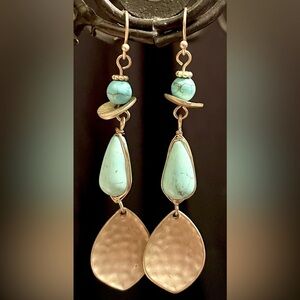 Gold tone and blue stone earrings. Lovely wire dangle earrings with faux ? turquoise blue stones and gold tone hammered metal accents. About 2 1/2” drop length; 4.49g each. Very good pre owned condition. Minor to no signs of prior wear.