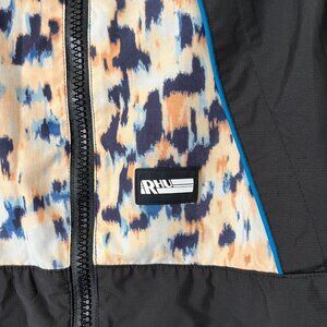 Long sleeve hoodie jacket in full zipper front closure. Has wide black panels with colorful animal print. Mesh inner lining with multiple pockets and adjustable drawstring around hem.
