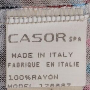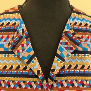 Add a touch of retro flair to your wardrobe with this Emilio Pucci button-down shirt, size 12 Eurupean (Feels more like an American Size 8). Featuring a bold, graphic design in black, blue, red, tan, and light blue, this top showcases zigzags, diamond shapes, and a mix of unique patterns that create a striking visual appeal. The 100% Rayon material, made in Italy, offers a comfortable fit, and the mother-of-pearl buttons with square detailing add an extra touch of sophistication. In excellent condition, this top’s unusual details make it a standout piece for any collection.