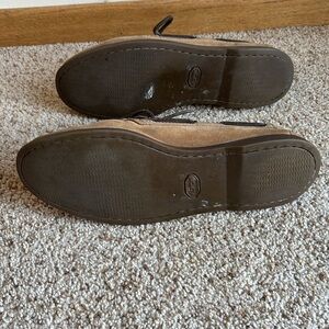 Brown suede uppers. Moc toe. Leather laces. Vibram soles. Made in Italy. No size. I am a US 10.5 and these are snug. I would say they would fit a 9.5-10. See photos for measurements.