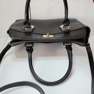 NWOT: Stylishly chic, "Rodeo Drive" black pebbled leather handbag/satchel with a croc-patterned top trim & sides/Bob Mackie signature/double handles/detachable shoulder strap/gold-tone hardware/bottom studs/turn clasp closure/signature fabric lining/zip pocket/exterior welt pocket by Bob Mackie. In excellent condition with working clasp/intact seams. **Disclosure: does not have the matching scarf.