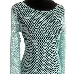 Stylish aqua mesh cover-up with long sleeves. Perfect for beachwear.