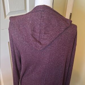 This purple cardigan sweater features an open-front design with a relaxed fit, perfect for layering. Its smooth, fine knit texture and full length cut make it a versatile addition to any wardrobe.