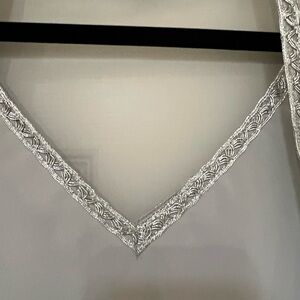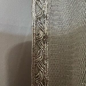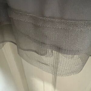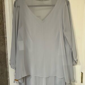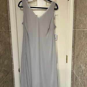 Elegant silver dress with layered design. Features sheer overlay and delicate trim. Perfect for weddings.