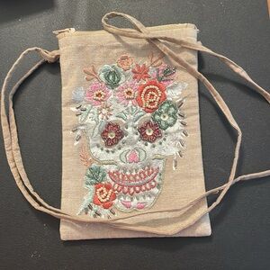 The item is a Dia de los Muertos sugar skull pouch.