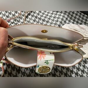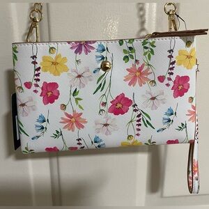 This Francine Crossbody Mini Bag features a floral print on a sturdy textured vegan leather fabrication, a front logo embellished snap strap, a narrow detachable half-and-half crossbody chain and strap, a detachable wristlet strap, both front and rear top slip pockets with snap closures, and a top middle zippered pocket.