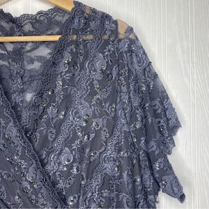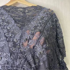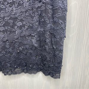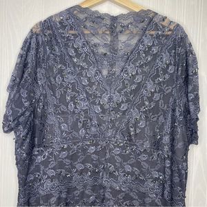 Steel Gray All Lace with sequins stretchy Body Con Midi Formal Dress. Back is all sheer lace, front is V-neck. Size 22W