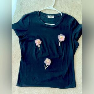 ABCD Anthropologie Black T-Shirt with Jeweled Pink Flowers Roses Petals