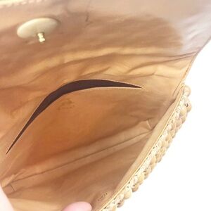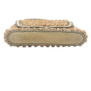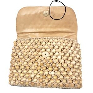 Rare Vintage Koret Wood Beaded Boho Woven Bag from Italy. Impeccably handmade with wooden beads woven with wicker material. Leather inside and handle strap. Small inside pocket. Fold over top with a button closure. Minor wear on the bottom and handle. Pen mark on inside by snap (See Image) but woven detail is perfect! Purse is very well kept and is definitely on trend achieving a boho chic aesthetic.