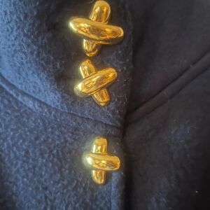 Vintage Amanda Smith Navy Blue Fleecy Cape Poncho. 3 large gold, X shaped buttons secure at the top. Mock neck. Batwing sleeves. One size fits most. 100% polyester.