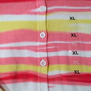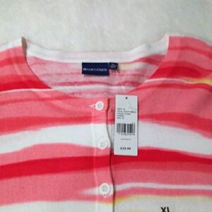 Brighten your wardrobe with this vibrant striped button-up sweater. Featuring a mix of pink, yellow, and white, this piece is perfect for any casual outing. Size XL, brand Northcrest.
