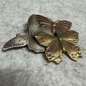 Vintage K&T Butterfly Trio Brooch Bronze/Gold/Silver Finish Metal Accent Pin