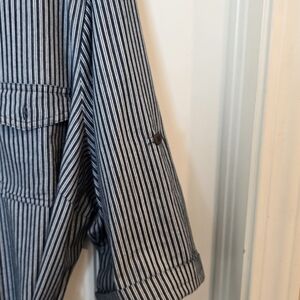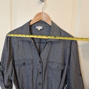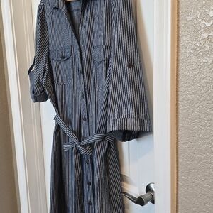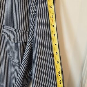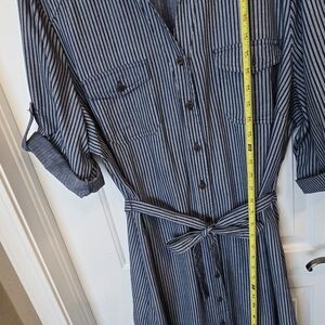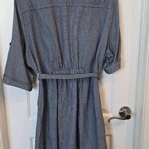 This cute striped buttonfront striped denim look dress gives a "Rosie The Riveter" style vibe. Retro Pinup style cotton dress. Fits a bit small in the hips for my body type.