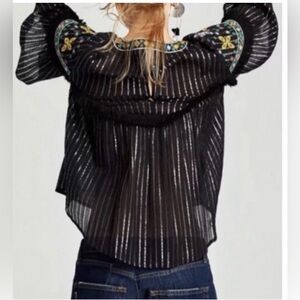 Festival Top With Bell Sleeves. NWOT. Excellent Condition. SIze XS. 100% Polyester. Black And Silver Shimmery Threads Throughout The Top. Pullover Design With 4 Working Buttons On The Back At The Top. This Zara blouse is super cute & flowy Embroidered Peasant Blouse - Sz Extra Small. This billowy crew neck blouse is enlivened with lush floral and geometric embroidery work outlined with fringe along the yolk. Thin black & silver stripes make this boho bell sleeved mixed media peasant blouse that much better! The quintessential festival, festive top.