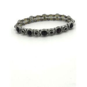 Add a sophisticated touch to your accessory collection with this silver tone bracelet. The dark stones add a subtle yet striking contrast, perfect for any occasion. Its stretch design ensures a comfortable and flexible fit, making it suitable for any wrist size.