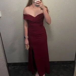 Formal wine red dress. Small was Worn once as a guest to a wedding. No damage to dress. Medium is NWT! Beautiful slit on the one leg. Very comfortable to dance the night away in.