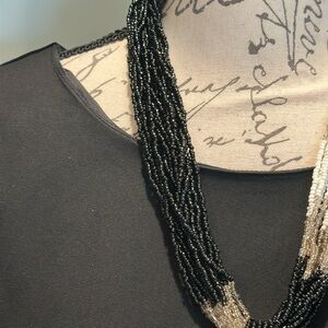 Gorgeous statement piece from Chicos - features multiple strands of black, white, and gray beads and completed with round shell pendant. Necklace is in great condition and clasps have been tested for integrity. Features a lobster clasp closure.