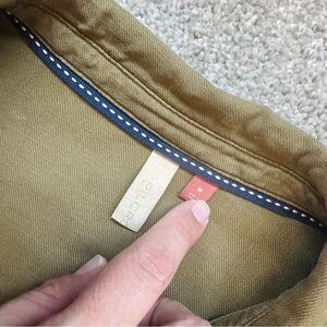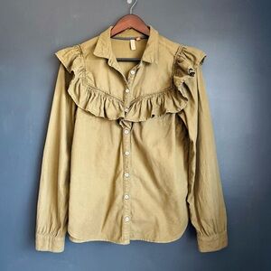 Anthropologie Pilco button up top with great ruffle detail. The shirt is an olive green chambray with an intentional slight fabric wear. Nice metal with white buttons. Long sleeved with gathered cuffs.