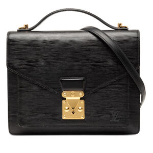 The Monceau features a vernis leather body, a flat leather top handle, a detachable flat leather strap, a front flap with S lock closure, an exterior front slip pocket, and an interior zip pocket. It carries a B+ condition rating.