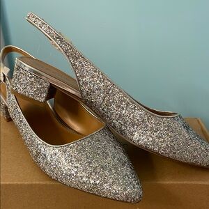These J. Crew silver heels boast a dazzling glitter finish, perfect for adding sparkle to any occasion. The slingback design ensures a secure fit, while the low block heel offers comfort and style.