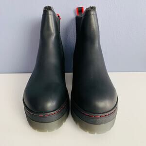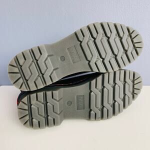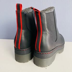 New in their original box, these black moto platform boots have some extra details like the red stitching around the base and the red and black stripe up the back.
