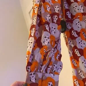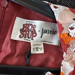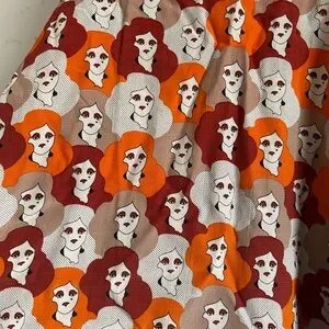 Artistic dress featuring a unique face print. Includes shades of red, orange, and cream. UK size 16 EUR size 44. Brand new, never worn, ordered from the UK, but did not fit.