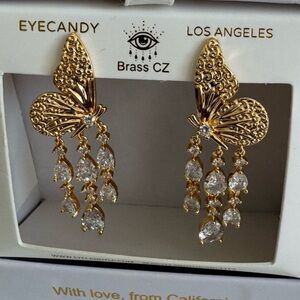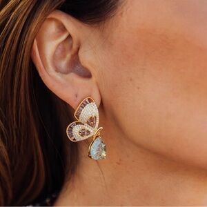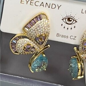 Eye Candy gold tone brass butterfly aqua blue teardrop cz stone earrings
