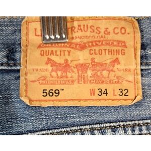 Levi's 569 Cut Off Cheeky Dark Wash Denim Jean Shorts feature a frayed hem and a 5-pocket design with peekaboo pockets. Made of 100% cotton denim in a medium wash, these high-rise shorts have a 2.0-inch inseam and a flat front. The size is 34 inches, suitable for casual summer occasions. This regular fit style is easy to care for and offers comfort, making it perfect for the beach, vacation, or a grunge-inspired look.